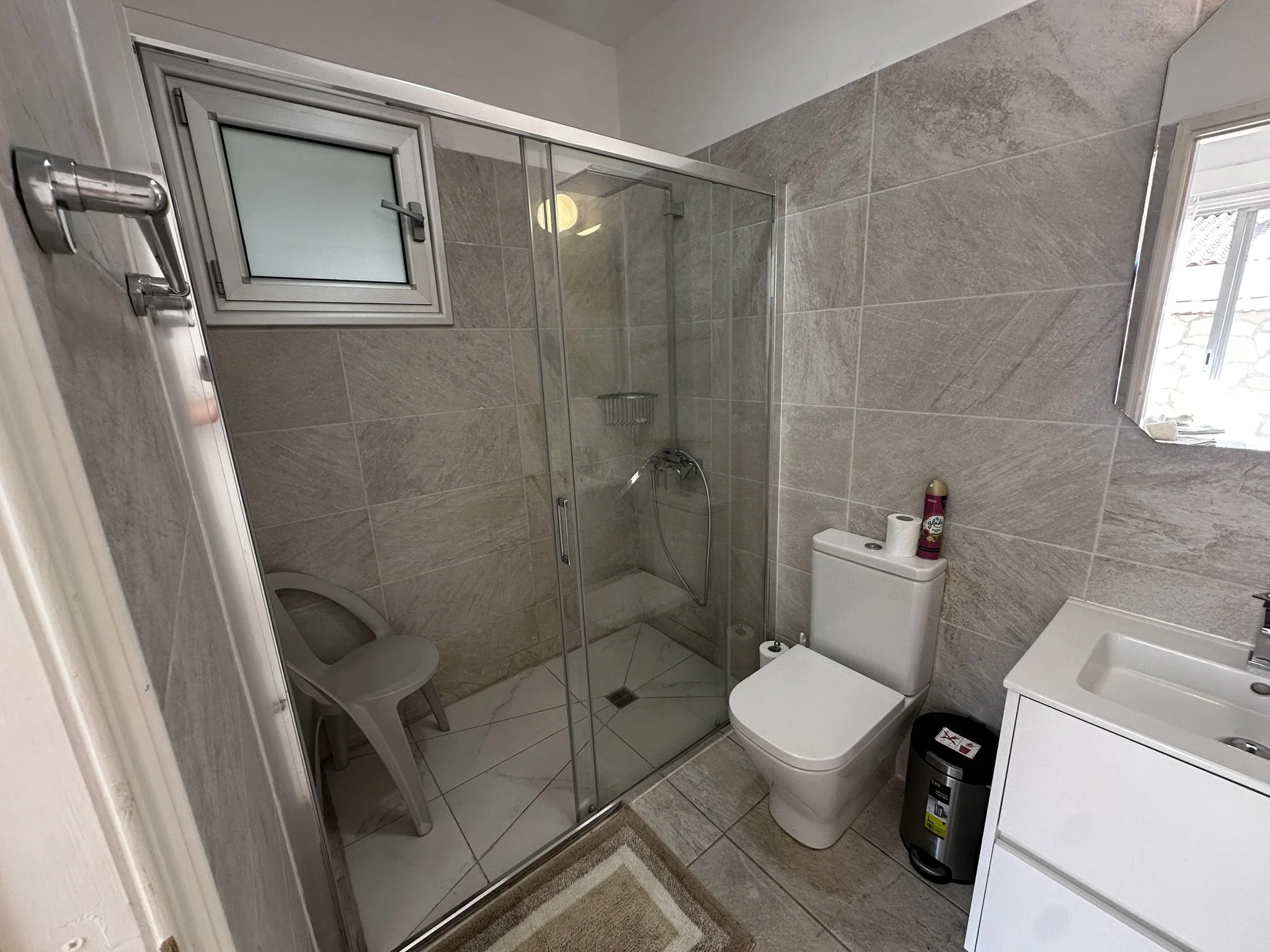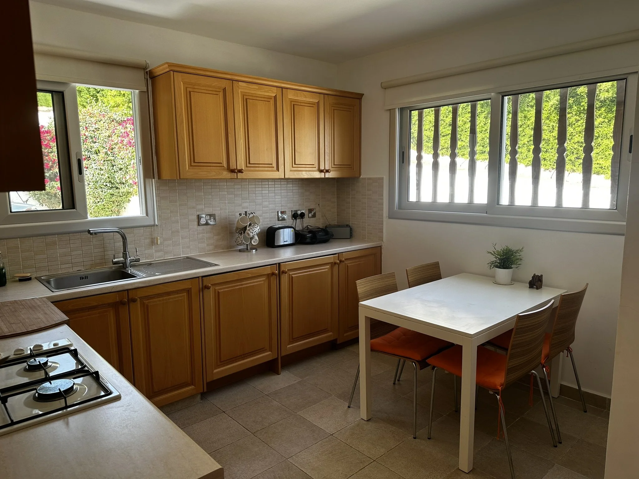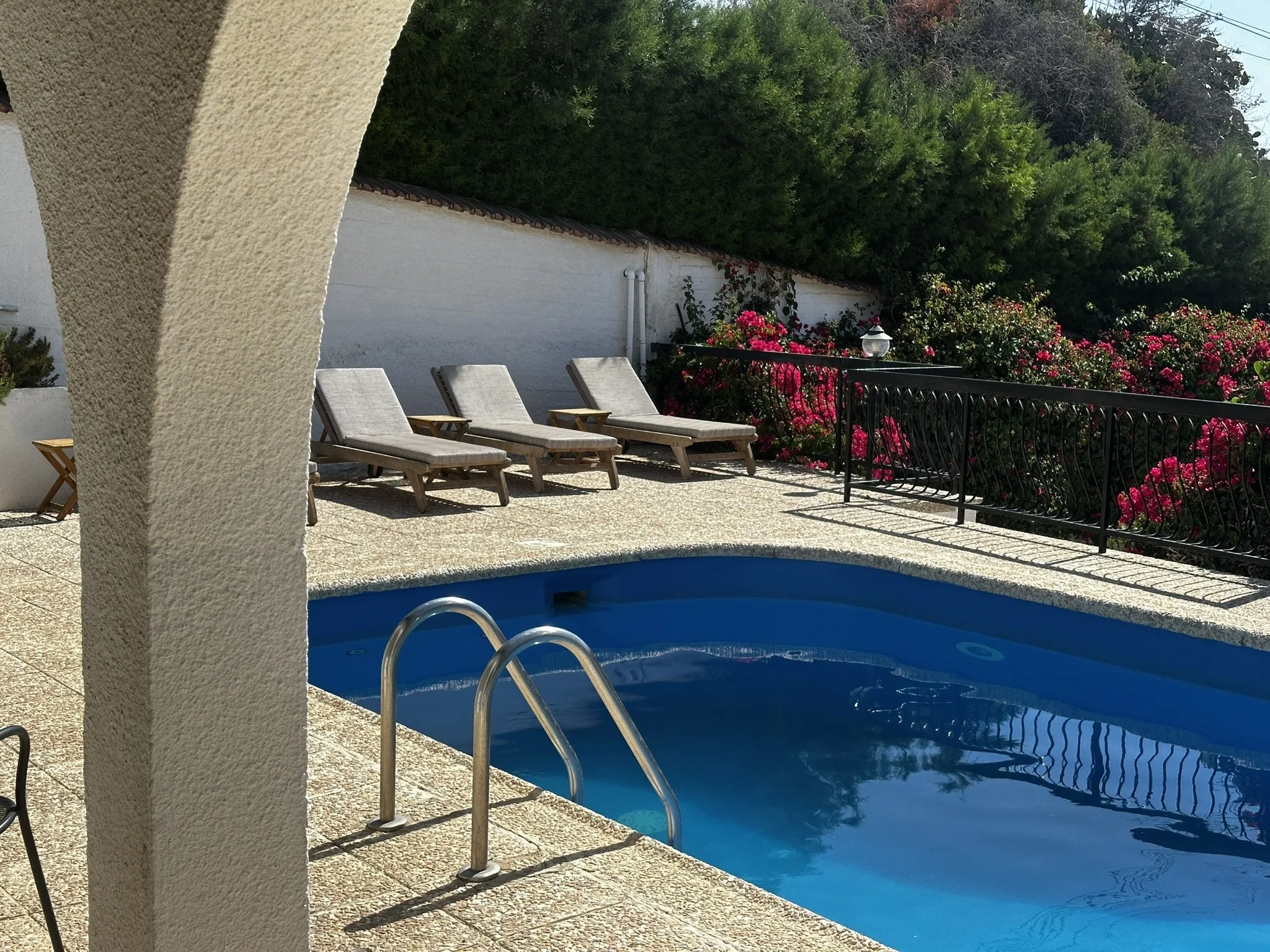 Solar-heated swimming pool with walk-in steps and rail. Pool side shower bathroom, mini kitchen with fridge. Patio furniture, sunbeds and umbrella. Large courtyard for parking